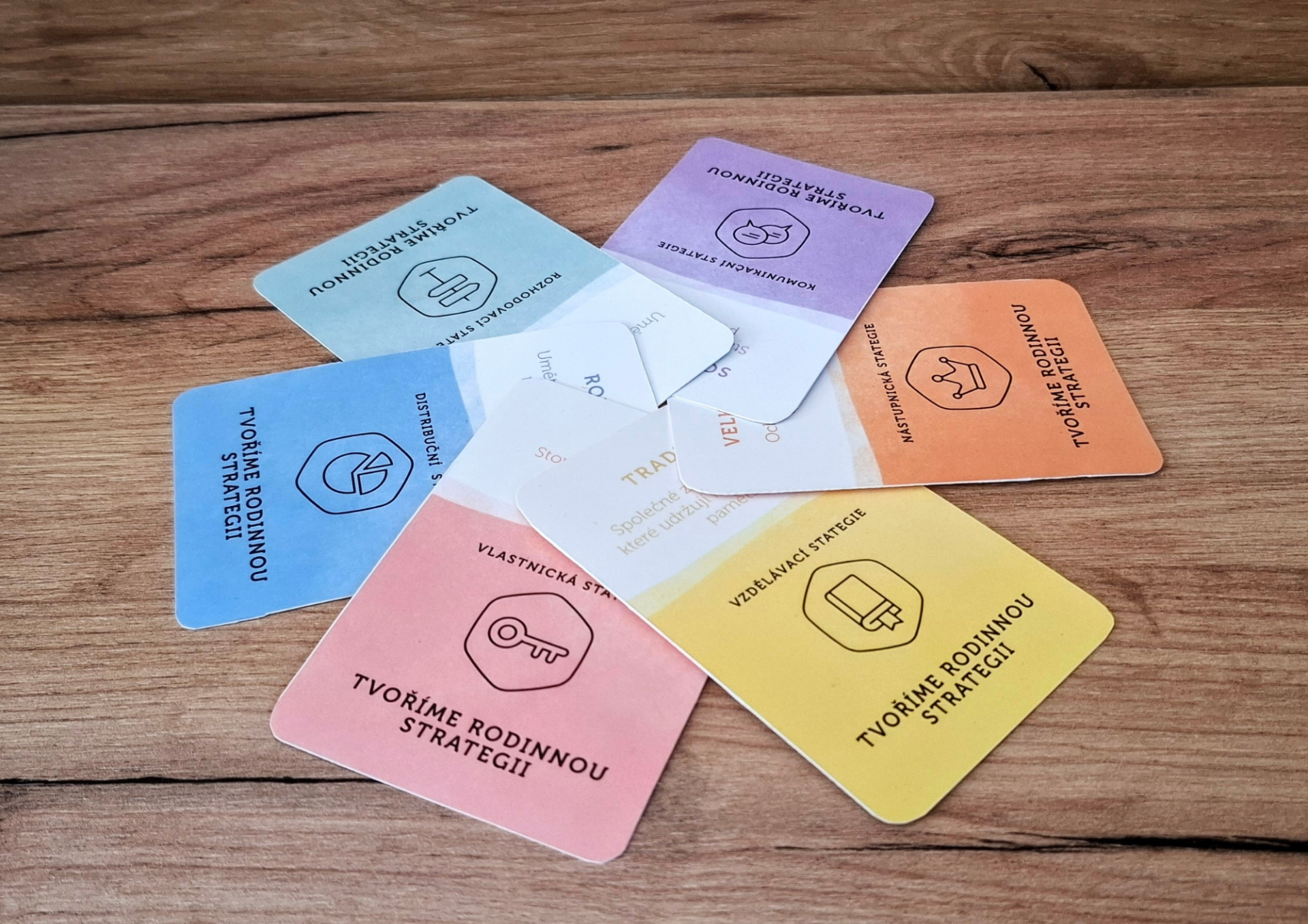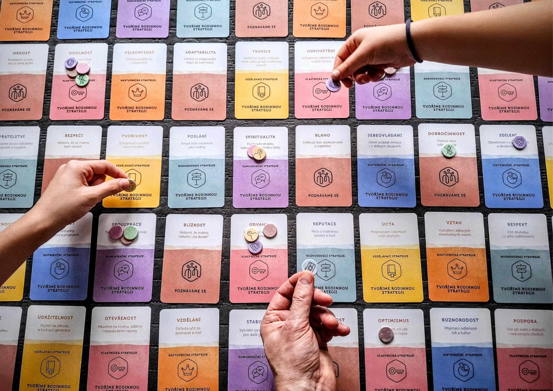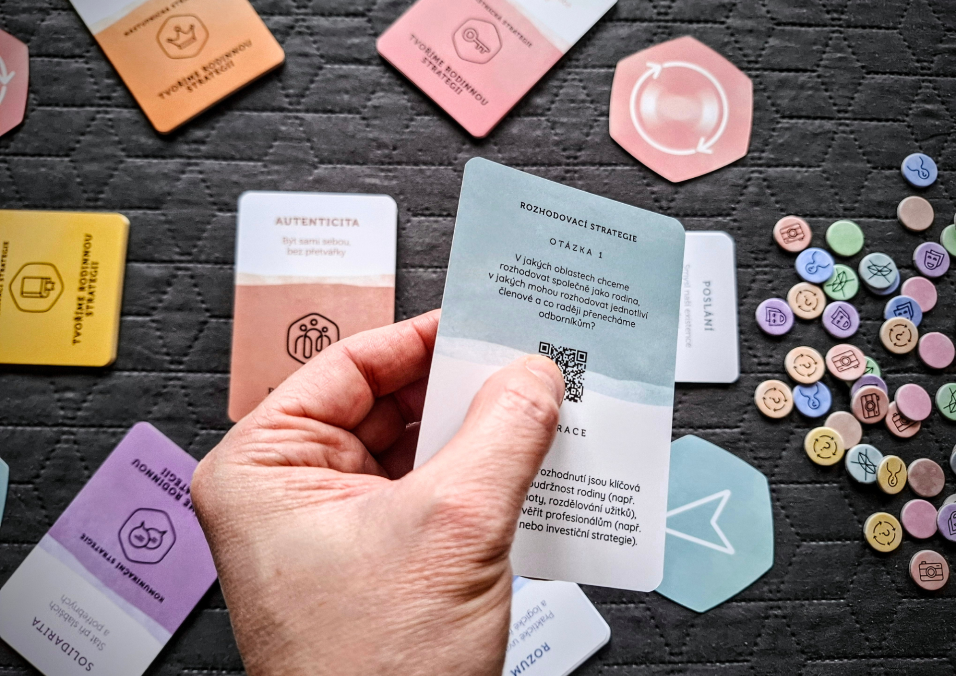 Hra rodinná strategie je multifunkční rodinný nástroj - nejen konverzační hra, ale i metodika pro rodinná setkání, objevování hodnot, formování strategie a tvorbu rodinné ústavy.